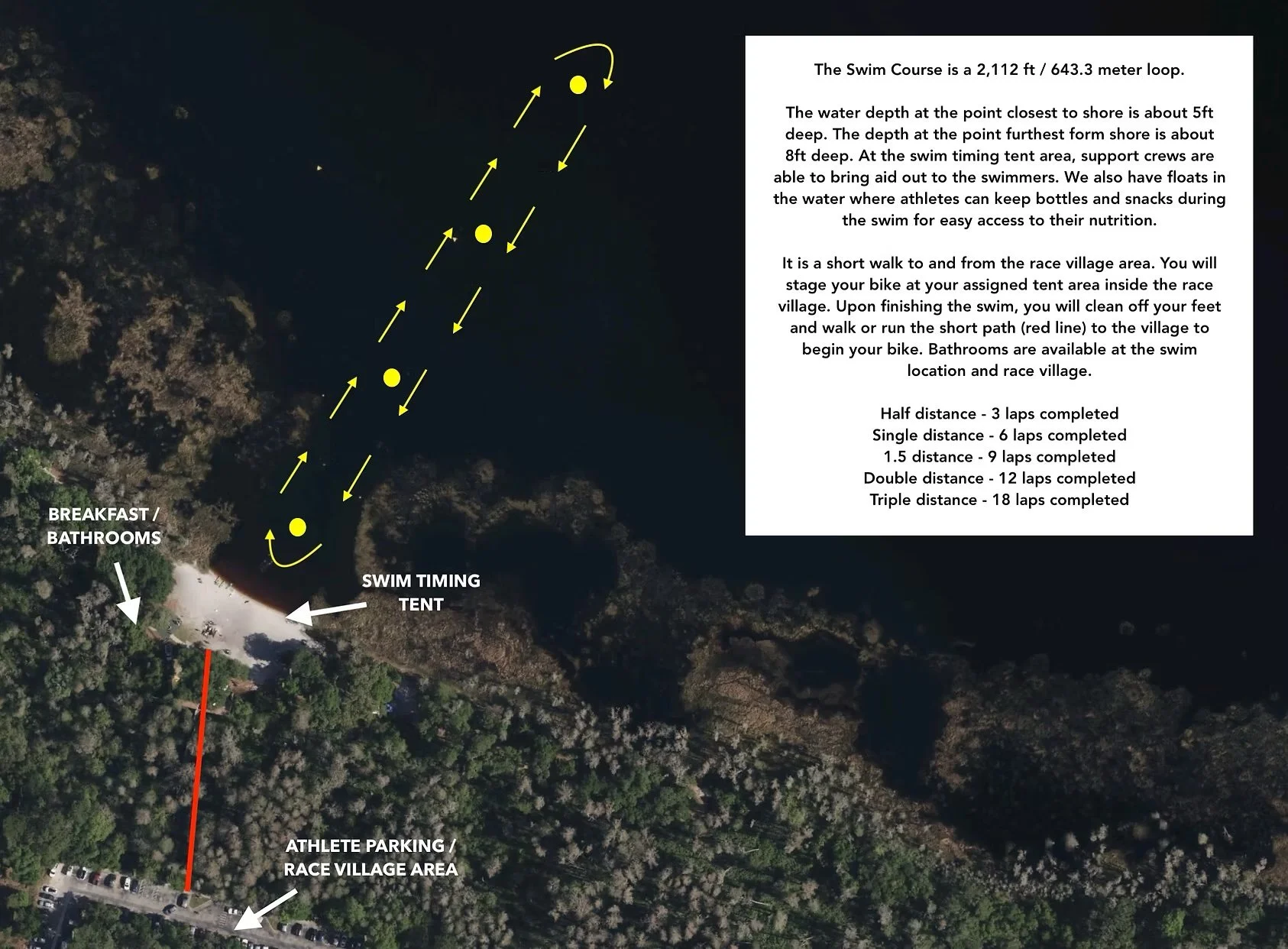 The swim takes place off the beach of Lake Louisa State Park on Lake Louisa, which is considered a shallow lake, with water depths no greater than 8 to 9 feet across the whole lake. The normal water temp for this race has been an average of 65 to 70 degrees, so wetsuits are recommended.